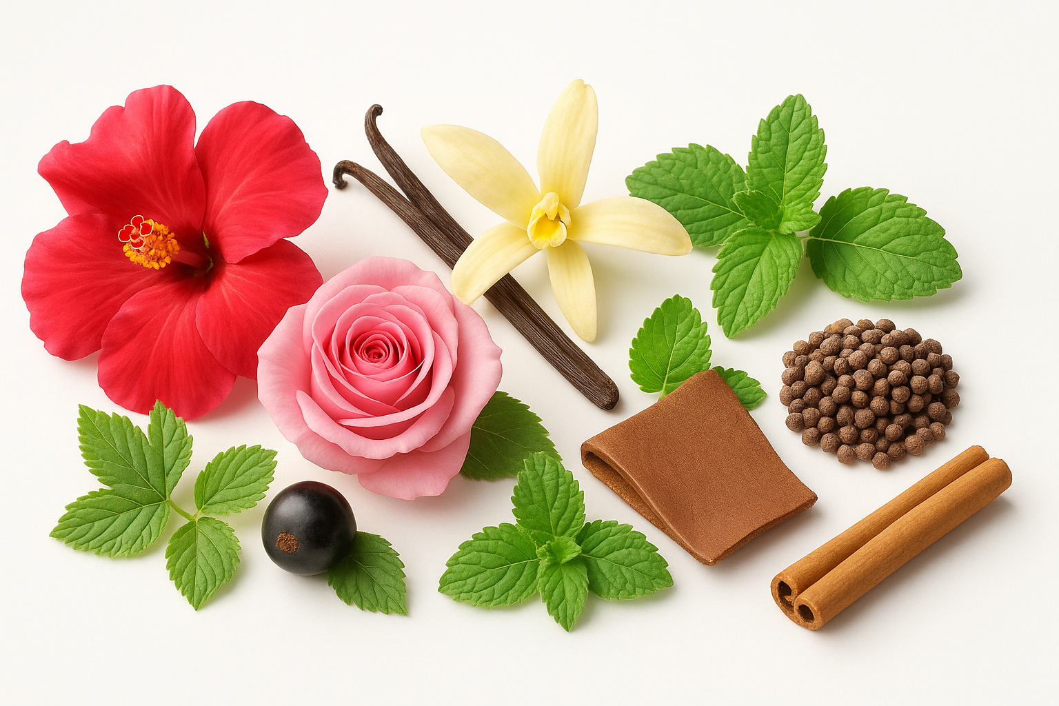 Hibiscus (Ebegümeci), Damask Gülü, Vanilya, Cassis, Deri, Nane, Ambrette, Tarçın